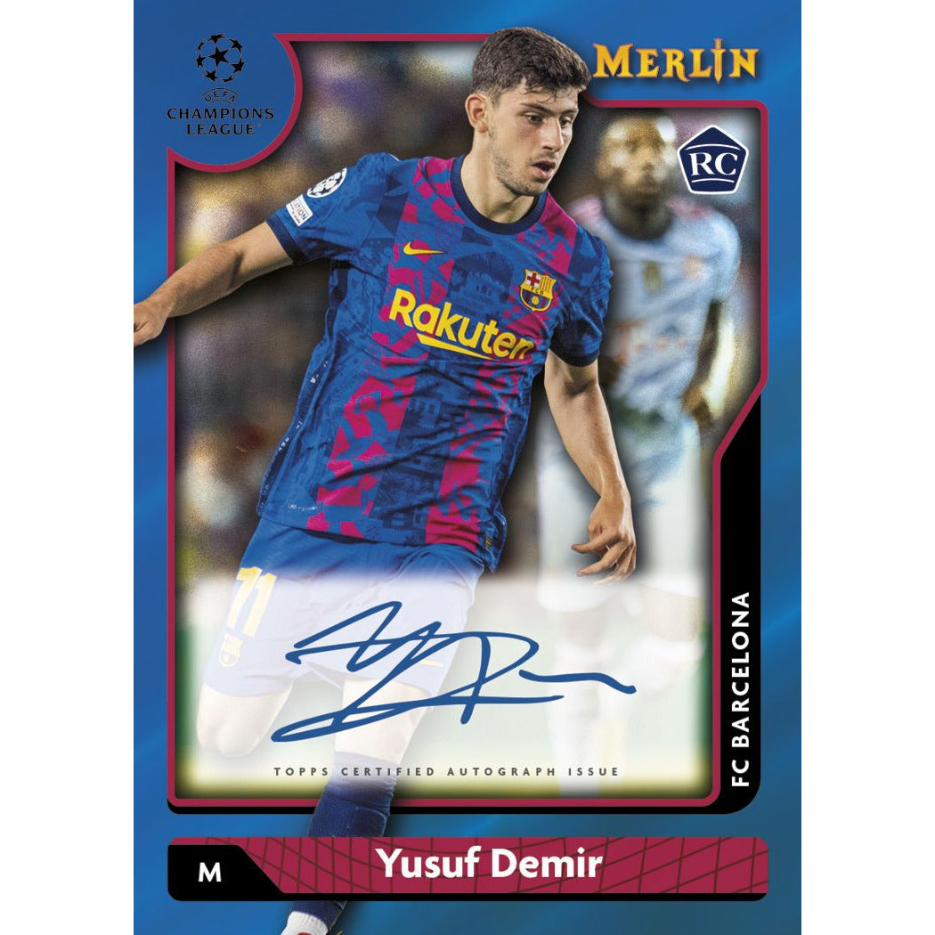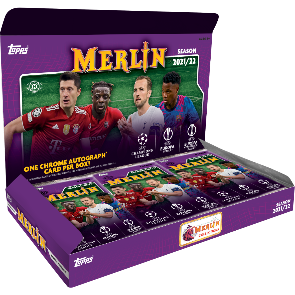 Each pack contains four (4) 2022 Topps UEFA Champions League Merlin base cards. Includes one (1) autograph per box.